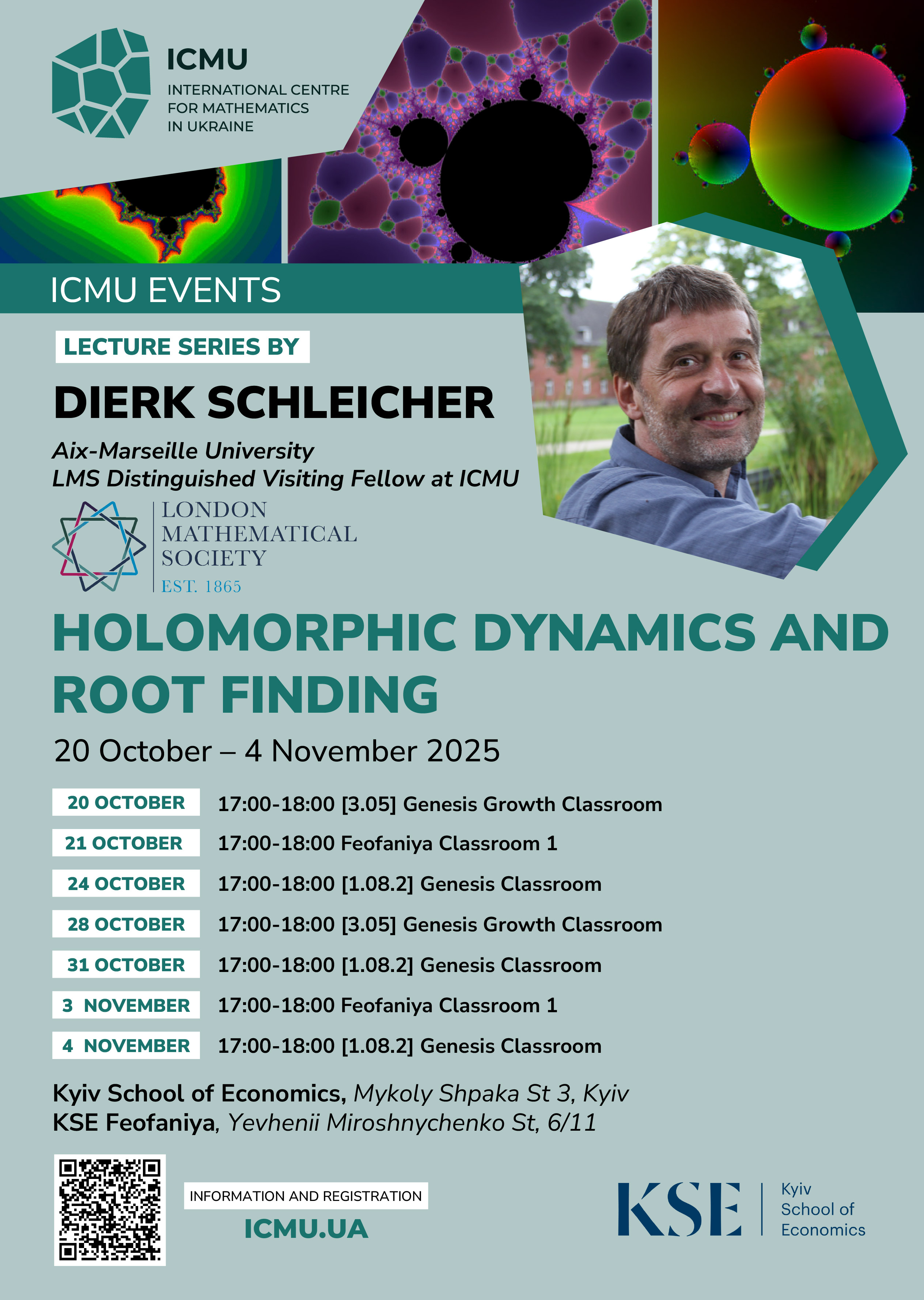 The lecture series focuses on the interesting and complex topic of holomorphic dynamics and its application to root finding. The course is taught by Dierk Schleicher (Aix-Marseille University, LMS Distinguished Visiting Fellow at ICMU). Lecturers are devoted to the fundamental problems of finding roots of analytic equations, exploring both classical and modern methods.