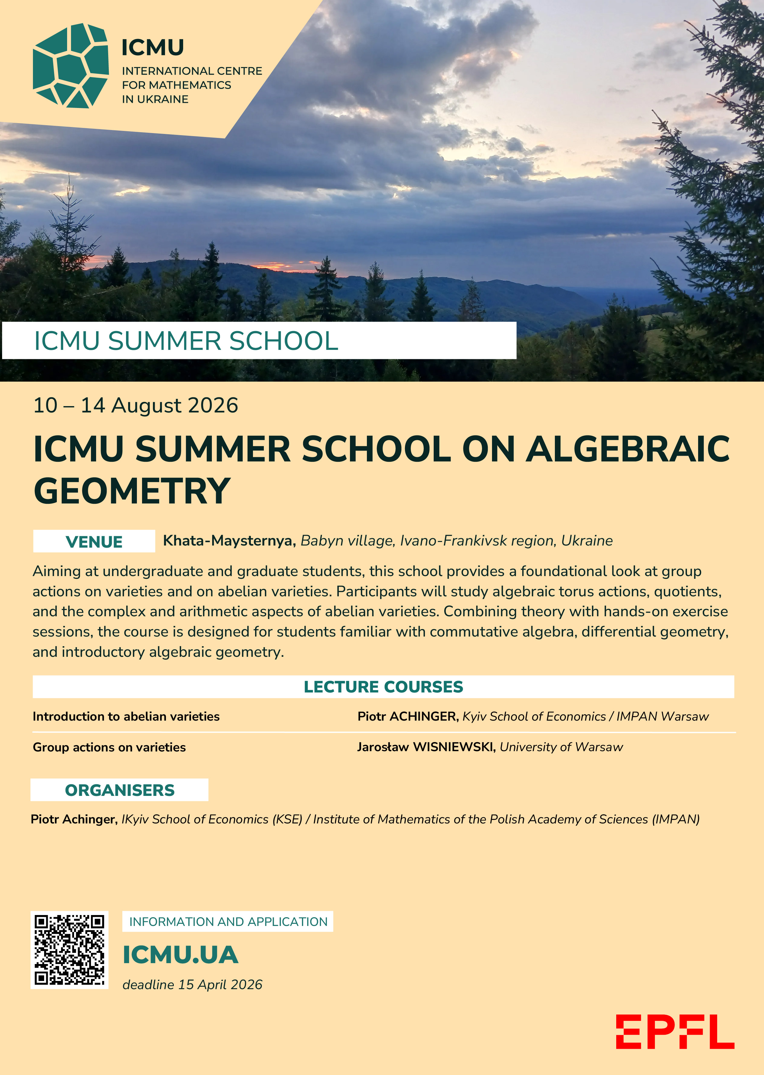 Пйотр Ахінгер (Київська школа економіки / IMPAN Варшава) прочитає вступ до абелевих многовидів. Абелеві многовиди є високовимірними аналогами еліптичних кривих. Над комплексними числами їх можна описати як фактор C^g за ґраткою. У курсі спочатку будуть досліджені комплексні абелеві многовиди, а потім арифметичні аспекти абелевих многовидів над числовими та скінченними полями.