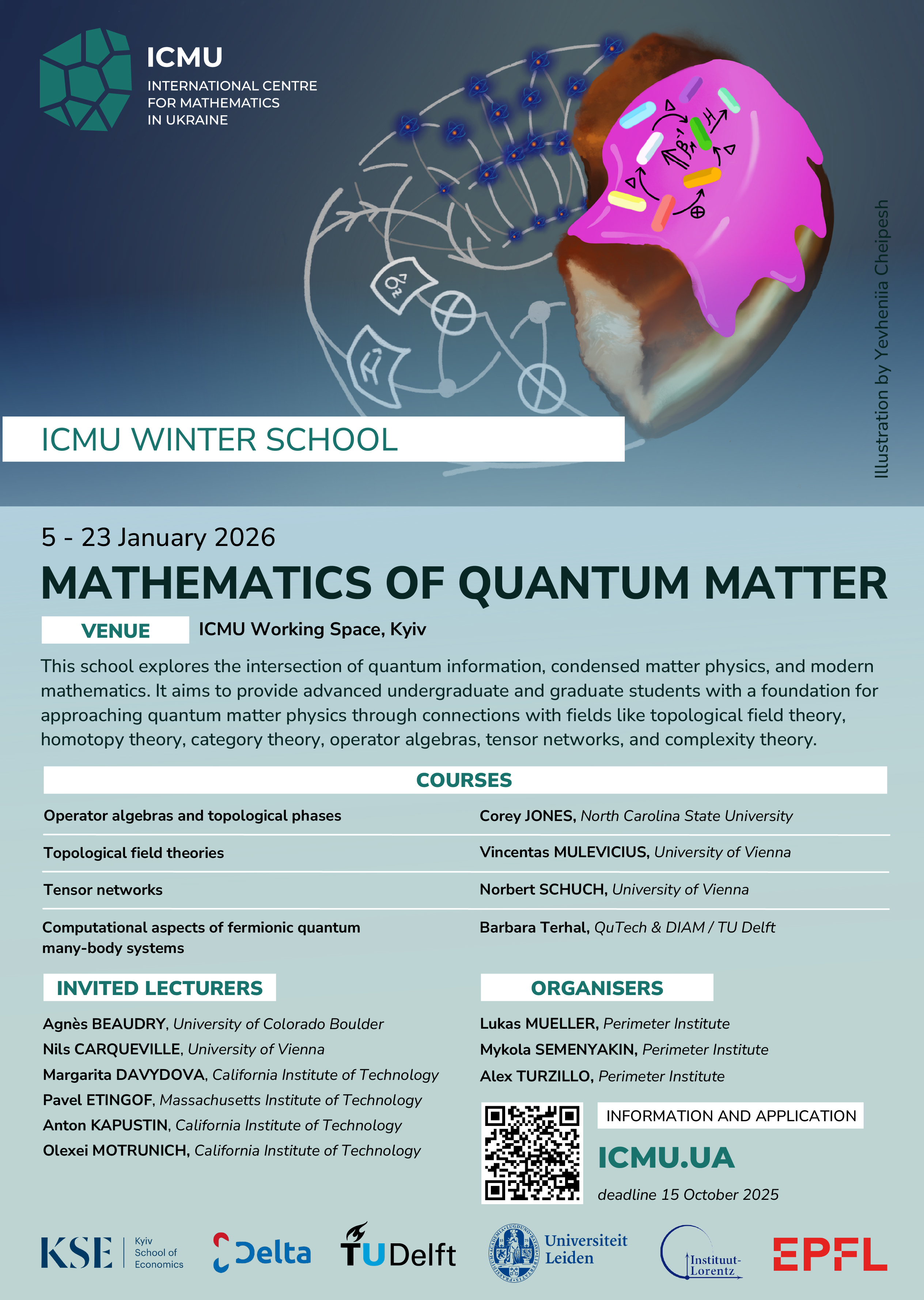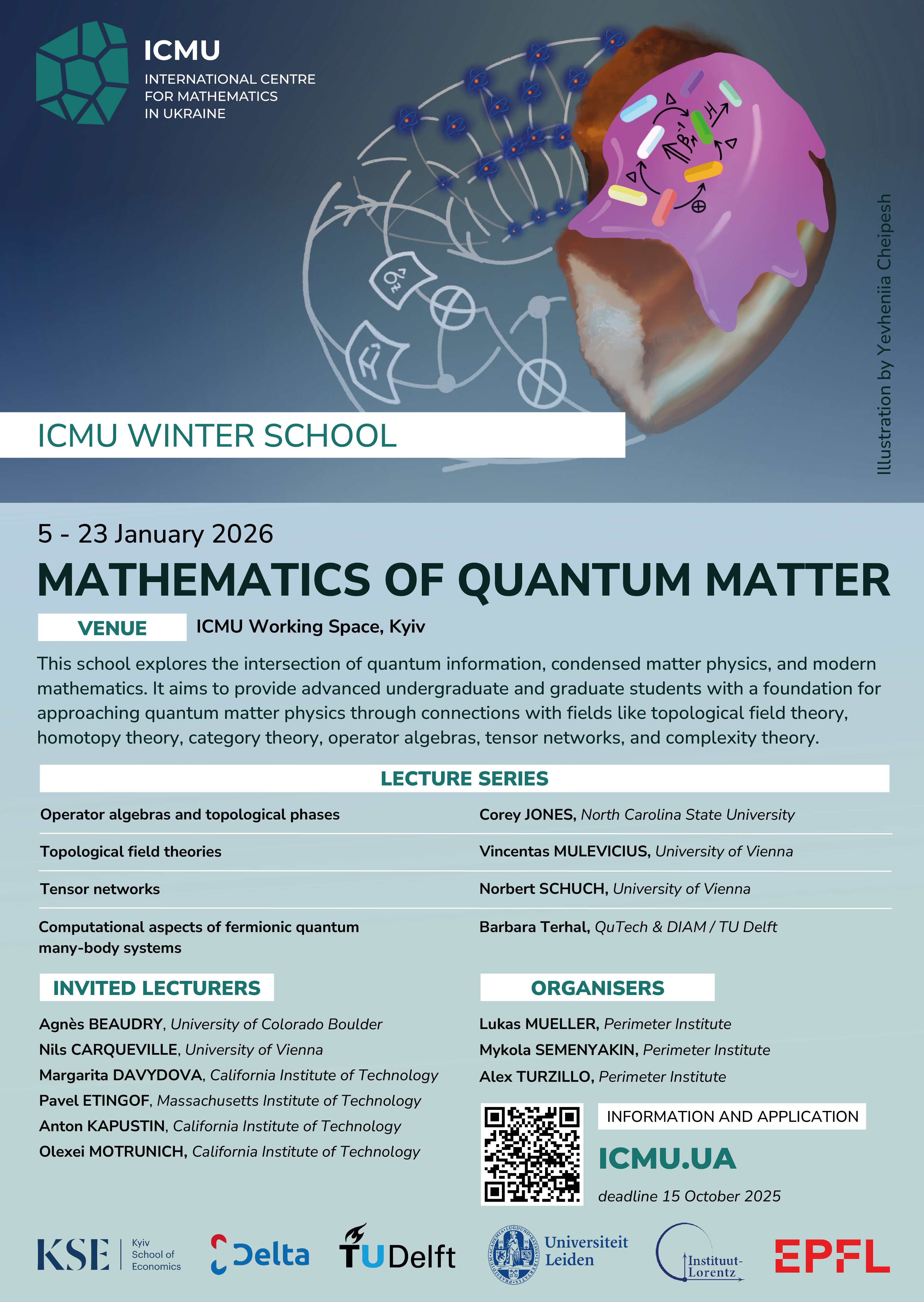 Останні роки виявили глибокі зв'язки між багаточастинковою квантовую фізикою та різними математичними концепціями, починаючи від топологічних теорій поля, теорії гомотопії, теорії категорій, операторних алгебр, тензорних мереж і закінчуючи теорією складності, кожна з яких є глибоко та розвивається сама по собі. Школа сприятиме укладанню контактів між студентами та експертами в цих галузях, сприяючи створенню фундамента для нових підходів до фізики квантової матерії, та її поєднанню із сучасною математикою. Обмін ідеями між математиками та фізиками має довгу та успішну історію. Багато проривів у математиці починаючи з 1950х років були натхненні квантовою теорією поля та теорією струн. Квантова матерія має потенціал відіграти таку ж важливу роль у математиці 21 століття.